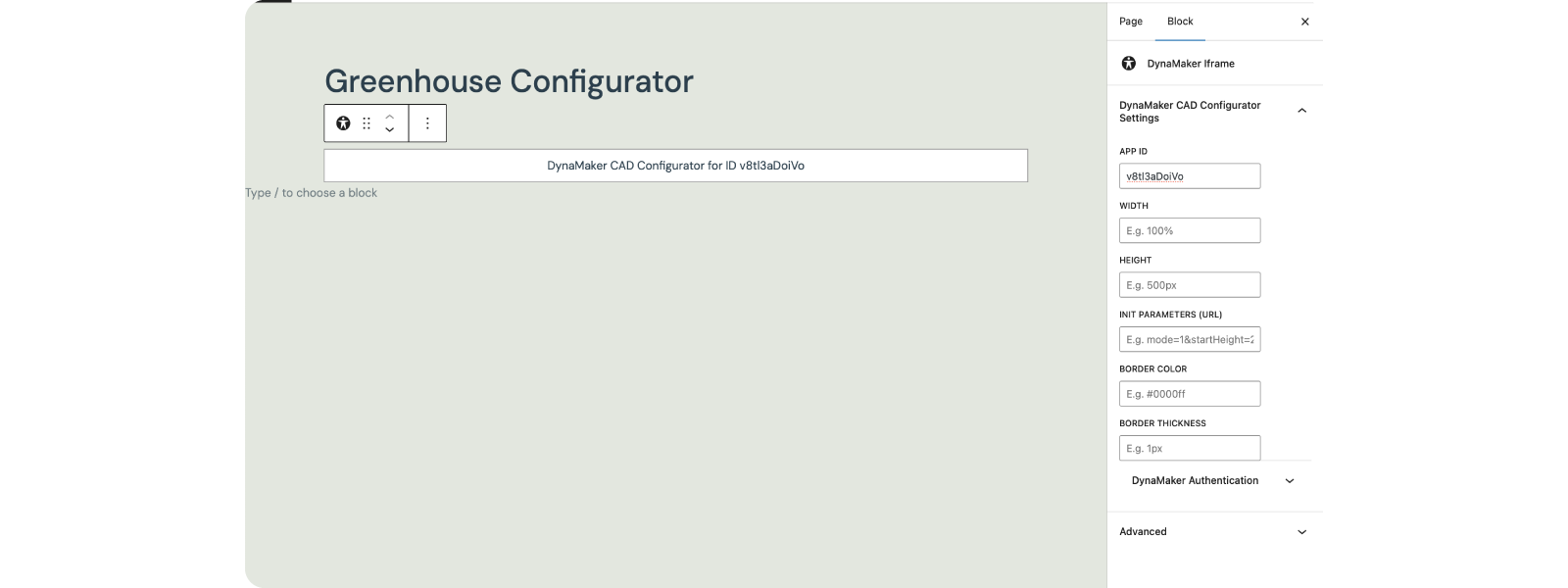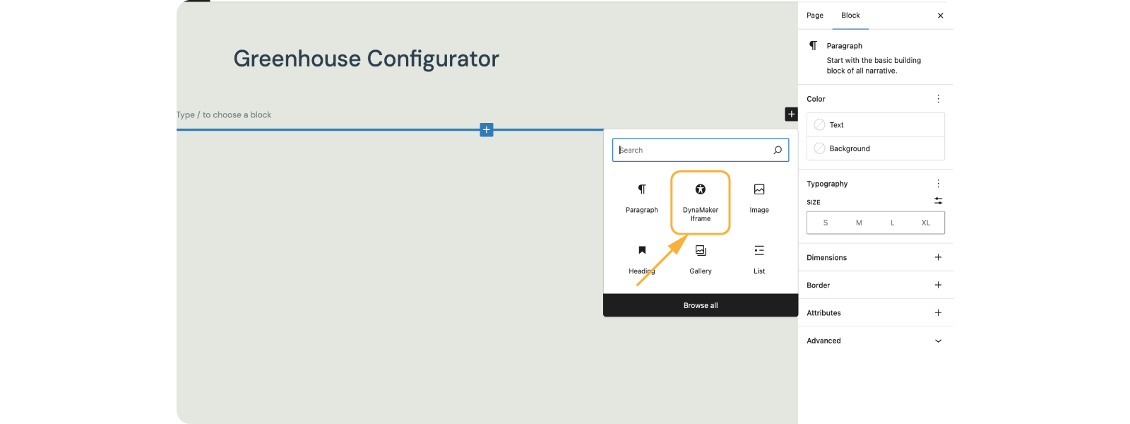 Once you have installed it, you can use content blocks when you edit a page with the Wordpress block editor. To embed your DynaMaker application, choose the "DynaMaker iFrame" block