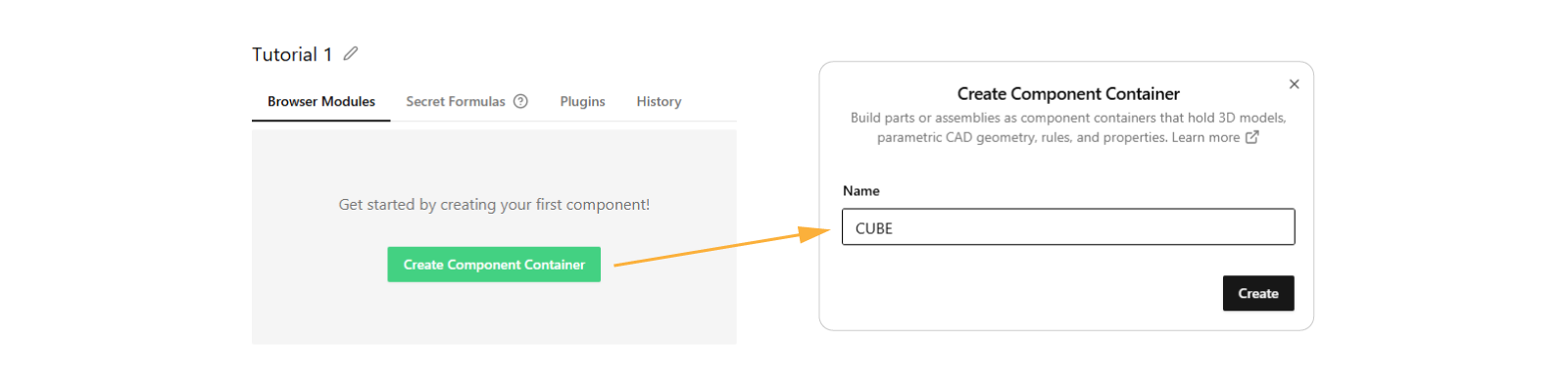 In DynaMaker, traditional CAD parts and assemblies are called Components. A Component generates the 2D and 3D visualizations of a configurable product. Create a component container and name it CUBE.