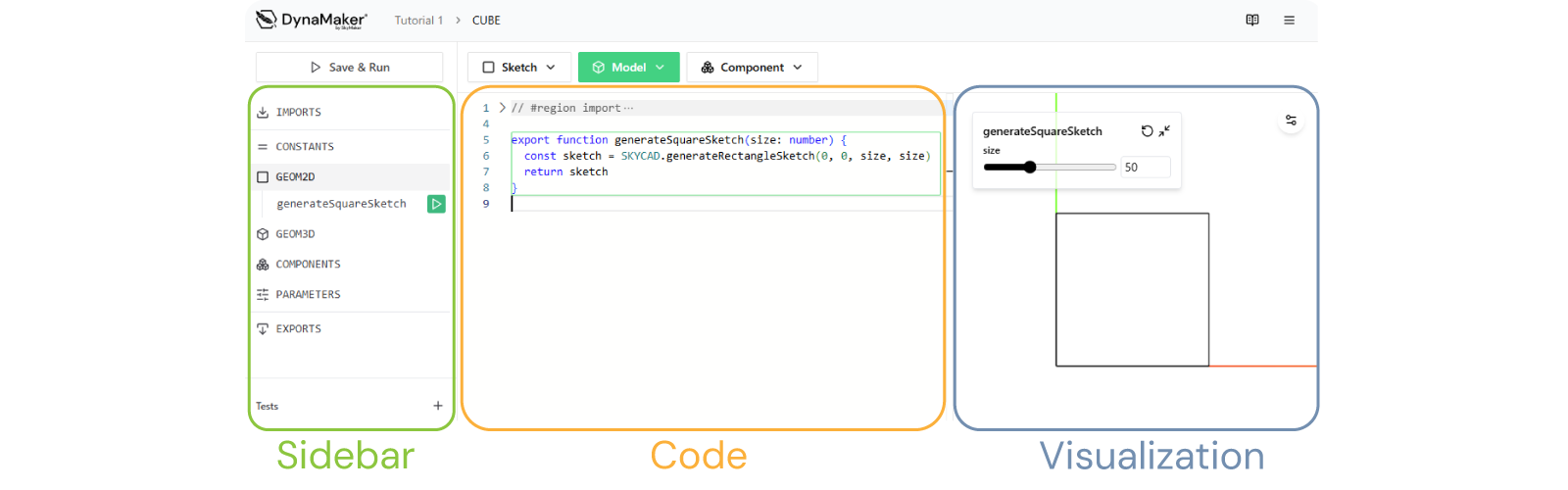 generateSquareSketchfunction that creates the square. - Visualization (right) shows the generated square with its name and a slider for