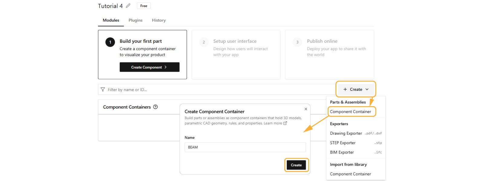 Create a component container as usual or by clicking on Create > Component Container at the right, and name it BEAM.