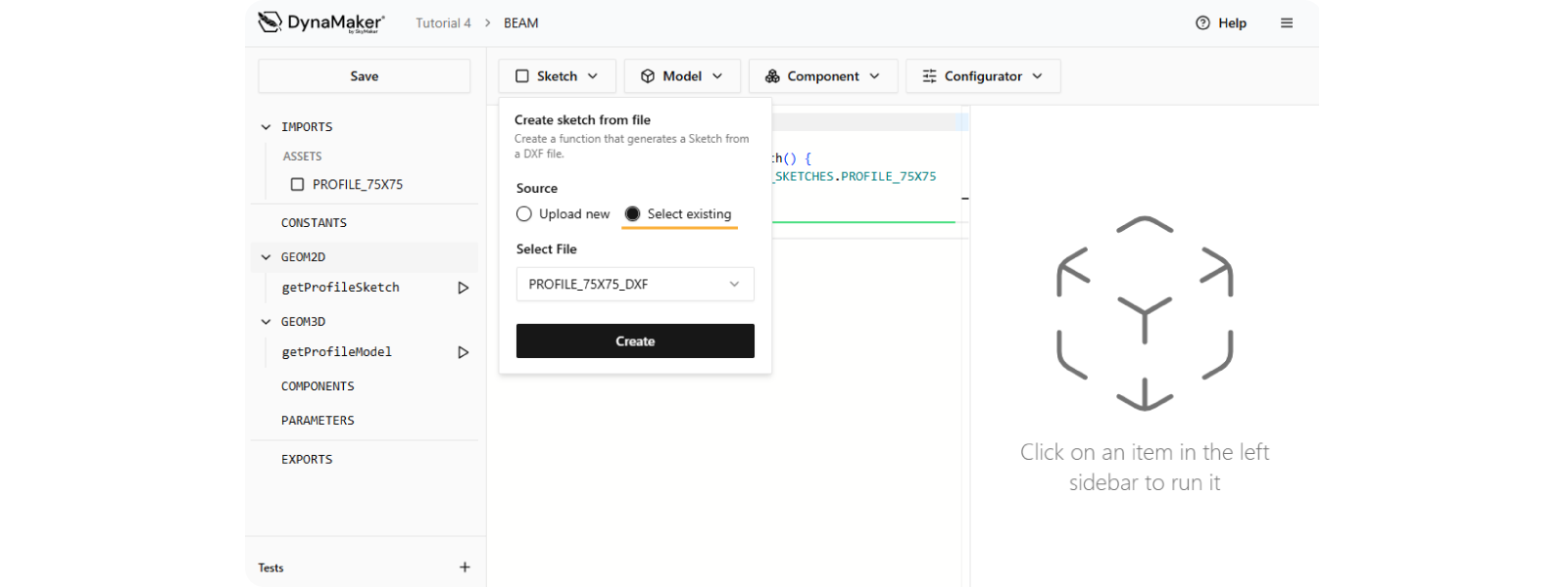 - At the top of the editor, click Create > From file... > Choose File PROFILE_75X75.dxf > Create.