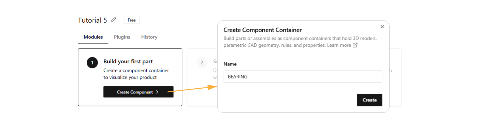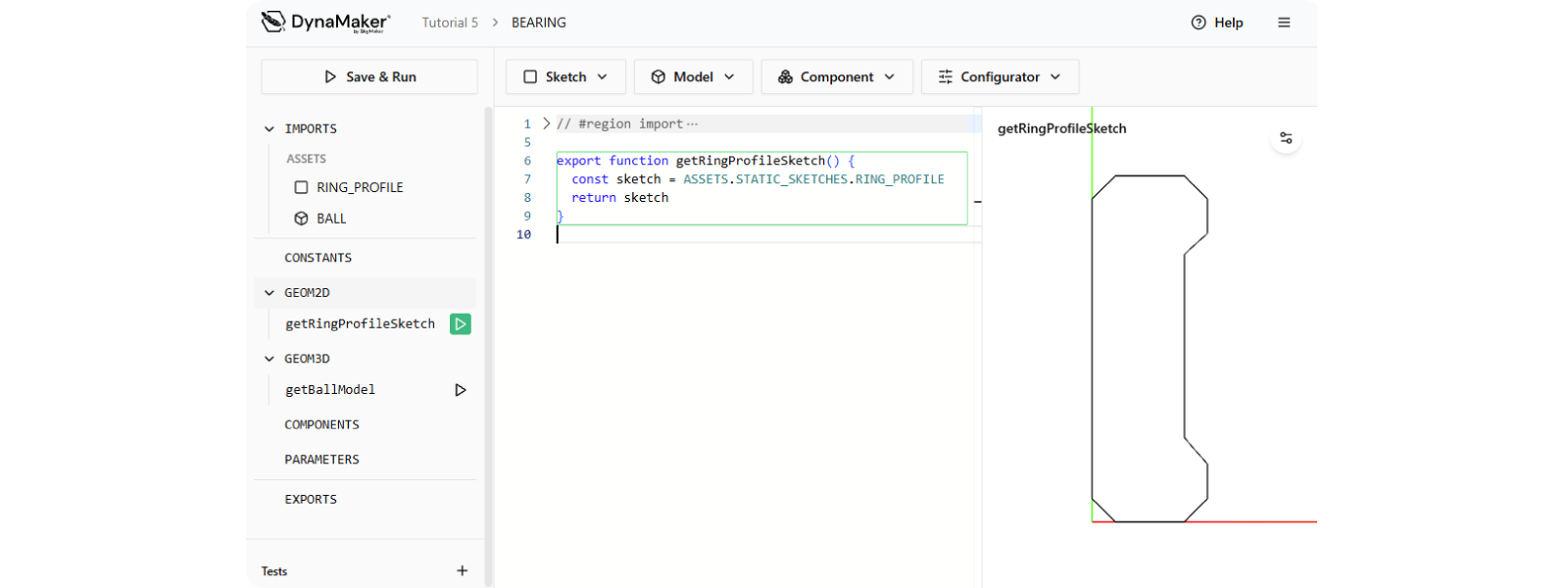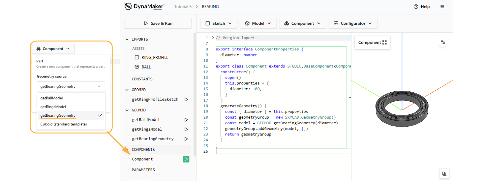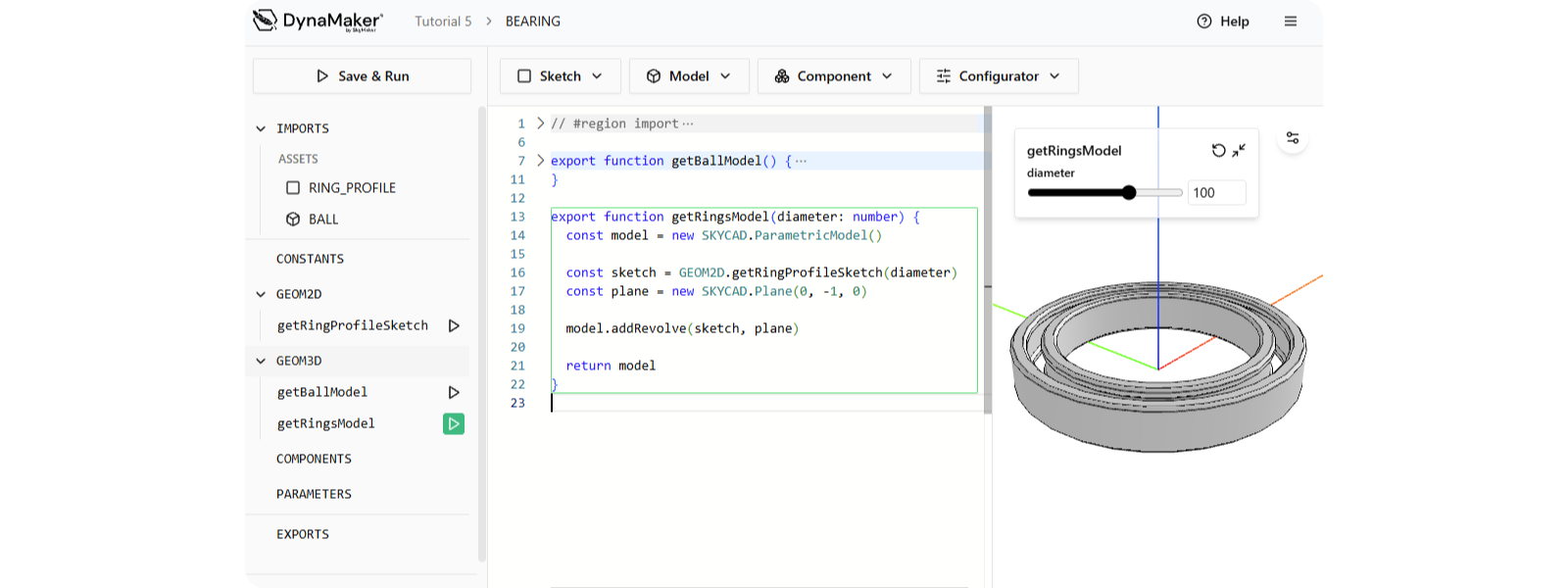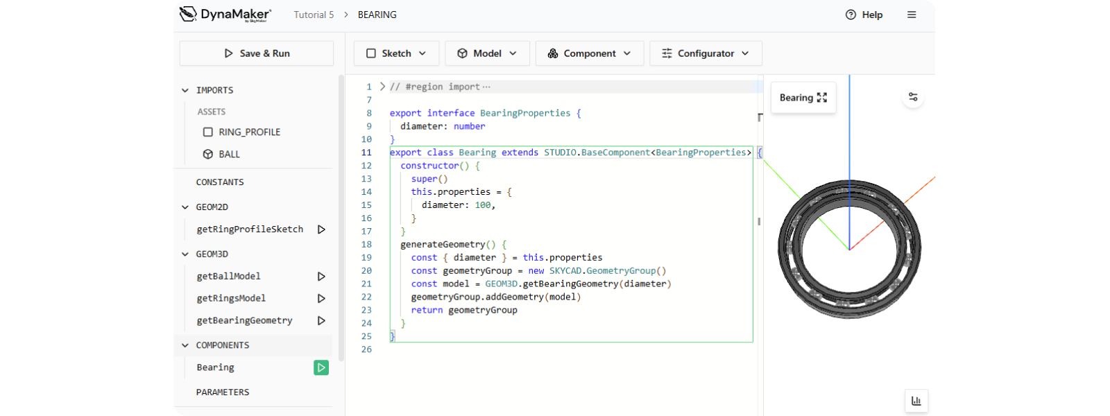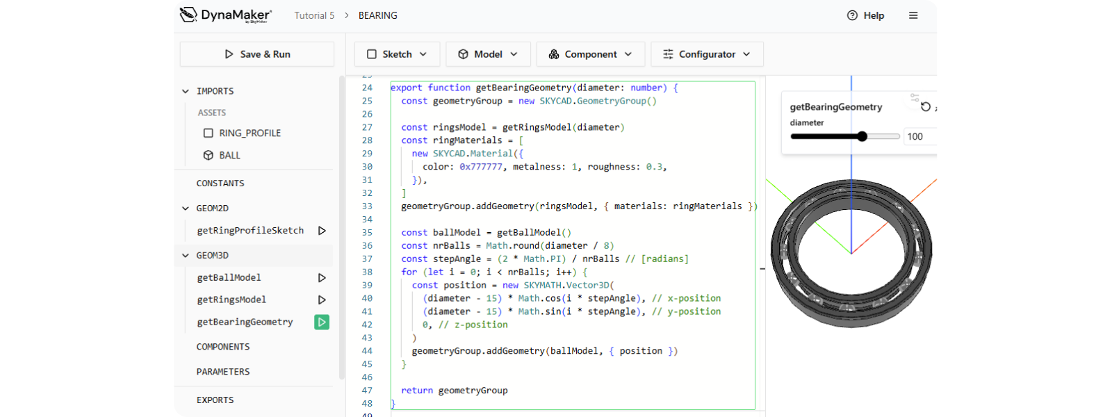 In this tutorial you learn the basics of creating a part (a component) with parametric geometry. The example product is a bearing whose diameter is configurable and whose number of balls updates automatically.