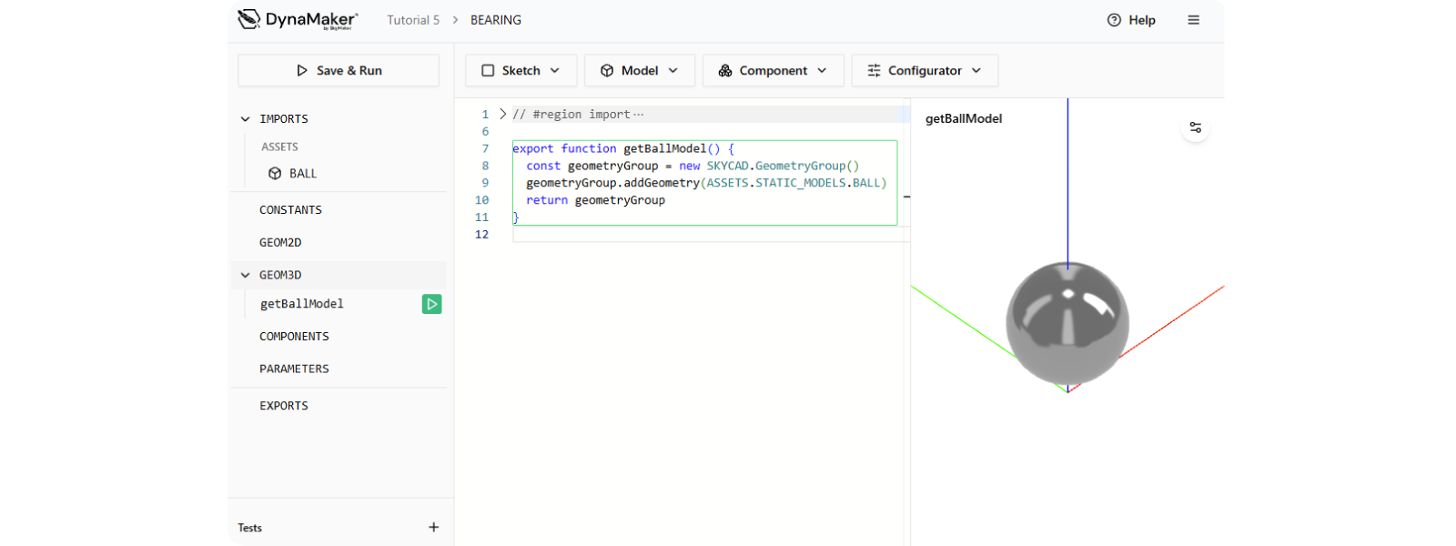 getBallModelandgetRingsModel, create a third function namedgetBearingGeometry. - Start it with an empty group: