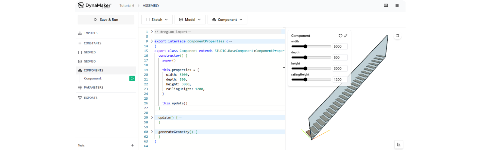 In this tutorial, you will learn how to create an assembly, which is essentially a component with subcomponents, following the configurable size. As a product example, we will use a configurable indoor staircase consisting of steps and glass railings.