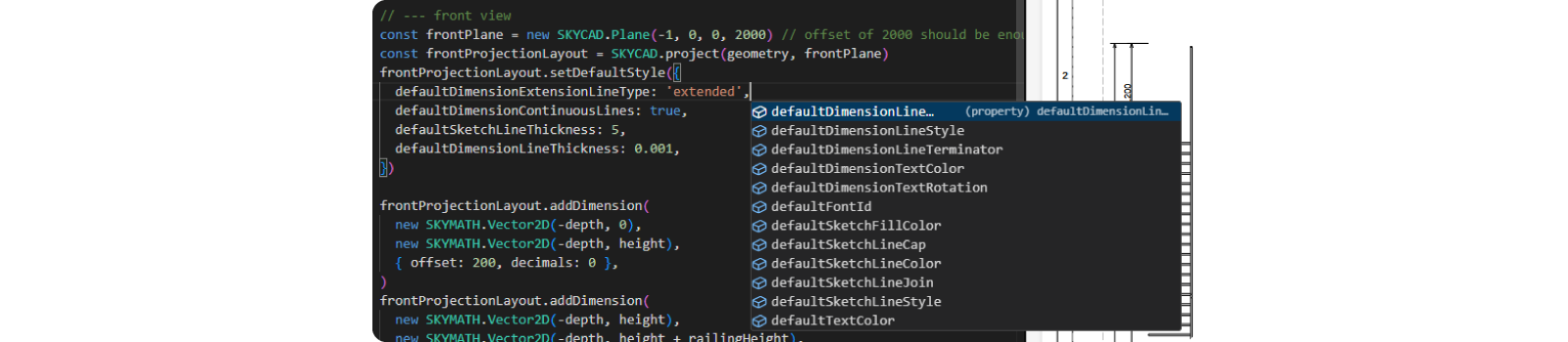 frontProjectionLayoutwith the respective plane and add it tocontentLayout:const frontPlane = new SKYCAD.Plane(-1, 0, 0, 2000) // offset of 2000 should be enough not to collide with the geometry