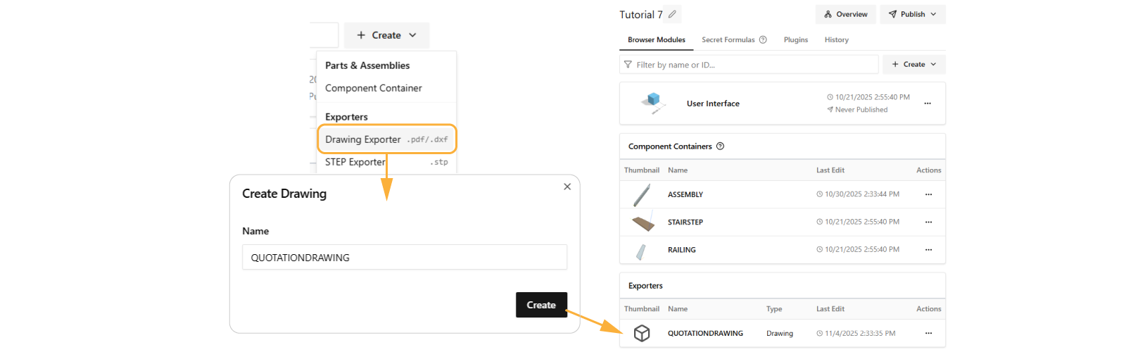 In the app dashboard, Create Drawing Exporter .pdf/.dxf and name it QUOTATIONDRAWING.