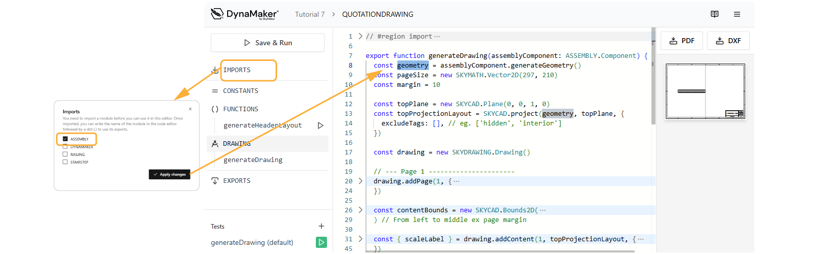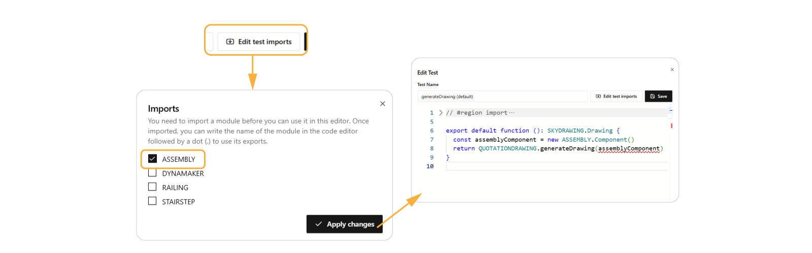 generateDrawing (default). - Open Edit test imports, check ASSEMBLY and Apply changes.