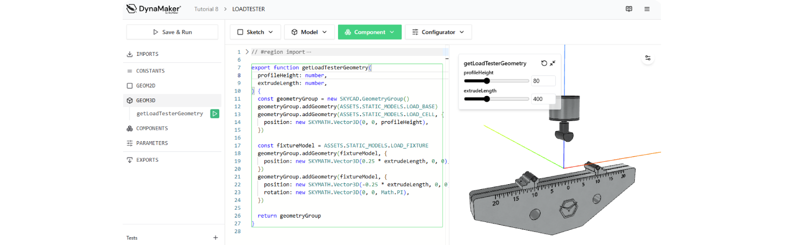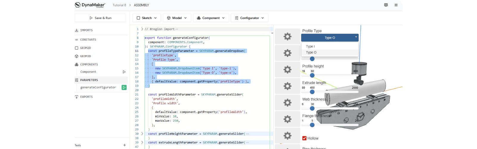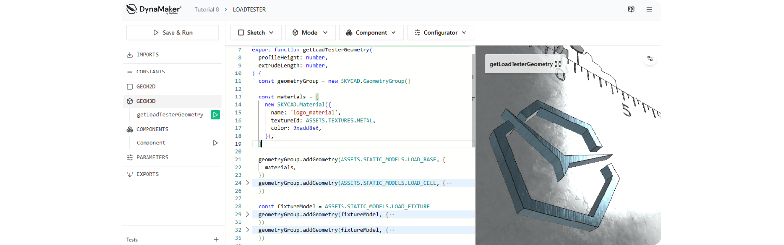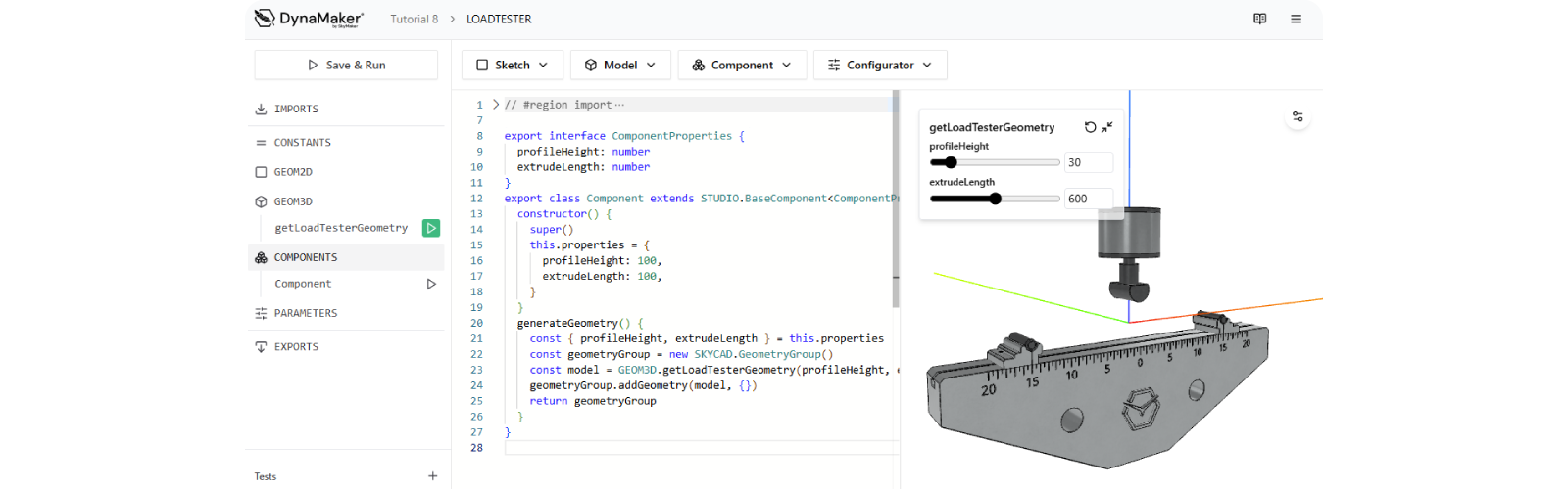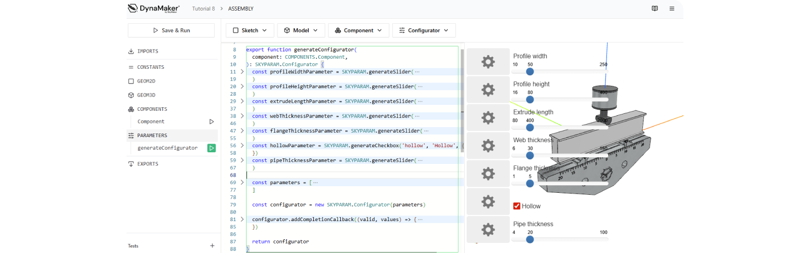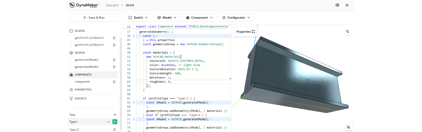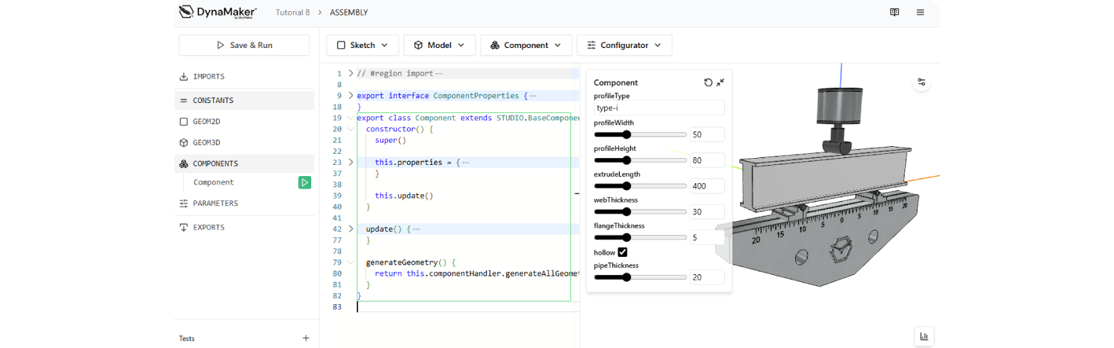 In this tutorial, you will learn the basics of one of the most powerful features in DynaMaker, i.e. Configurators, together with texturing. As a product example, we will use a three-point flexural test with a profile configurable in cross-section.