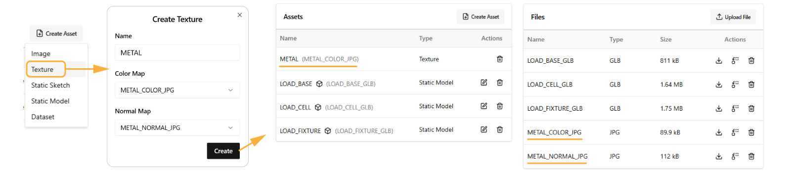 - Click Create Asset/Texture, with name e.g. METAL, and upload both without creating an Image asset.