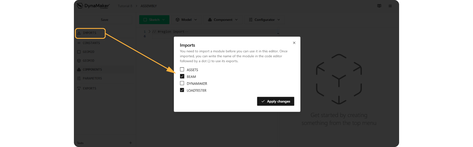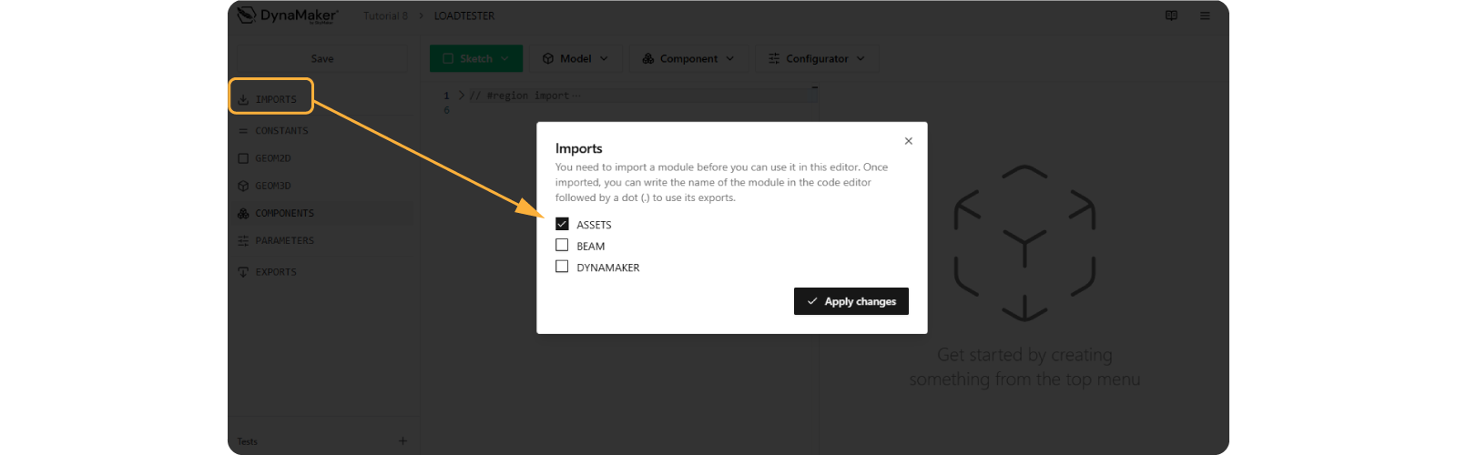 At the top of the left sidebar, via IMPORTS, import ASSETS.